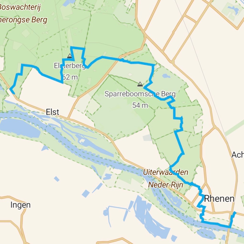 Vanaf de heuvel gaan we naar het zuiden door het ene na het andere bos. Op een bankje met uitzicht op De Enk gaan we rusten en eten fruit en drinken wat wij bij ons hebben. Na deze pauze gaan we landgoed De Tangh in. Op de rand van de bebouwing van de stad Rhenen komen wij een groot bord tegen: Wolf gesignaleerd, met daaronder een foto van een wolf en daar weer onder een lijstje met handige tips in de ontmoeting met een wolf. Enige kennis van de basisetiquette voor het onderling verkeren kan geen kwaad. De routemakers hebben bij de bebouwing toch nog een groene route gevonden. In de wijk Molenberg houden we even eerbiedig stil bij een Minibieb. We komen langs Harpwinkel De Zingende Snaar, in een voormalig gebouw van de plaatselijke kerk. De harpe Davids klinkt volop. Aan de doorgaande weg in het centrum staat Patisserie Van Woerkom. Henk vindt het noodzakelijk om even van de route af te wijken en de winkel binnen te gaan. Ik besluit om hem niet in de steek te laten. Hij bestelt meerdere luxe bonbons. Ook steekt hij zijn hand in een schaaltje met chocolade. Ik besluit om mij netjes te gedragen en neem niets. Ik denk af en toe aan mijn suikerspiegel. Eén van de chocoladedames biedt mij een suikervrij stukje chocolade PUUR aan dat zij uit de verpakking haalt. In mijn ongeremdheid zeg ik dat ik liever geen puur heb. De andere dame heeft al een verpakking met suikervrije MELK chocolade in de hand. Ik neem dit met enige schaamte aan. Het smaakt heeeerlijk. Wanneer Henk zijn rugzak opnieuw inpakt komt een dame die onze leeftijd nadert in de winkel en mengt zich enthousiast in het gesprek en prijst de beide chocodames en uiteraard ook de producten uit eigen huis. Gezamenlijk verlaten wij de winkel. Wij lopen door het oude centrum, langs het Stadsmuseum, langs de beroemde Cunerakerk. Aan de toren wappert de Nederlandse driekleur vanwege de verjaardag van prinses Beatrix. Het carillion speelt over een roodborstje. Ik dacht aanvankelijk dat het een sinterklaasliedje was, maar Henk heeft verstand van muziek (en de tijd van het jaar). Op de hoek van de Rijnstraat en de Buitenomme ontwaren wij nog een Minibieb. De route gaat naar de Rijnkade en dan volgen wij het asfaltpad langs het water, even later dalen wij af van de dijk en gaan door de uiterwaarden. Onder de brug door en dan naar het station. We nemen een noodzakelijke afsluiter in Grand Café Cunera. Er is geen warme melk beschikbaar, maar wel heerlijke erwtensoep en hartelijke gastvrijheid. Hier gaan we de volgende wandeling verder, op naar Wageningen.
