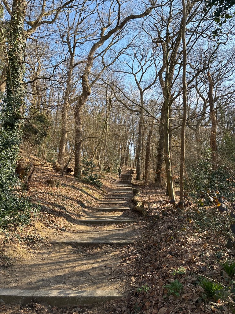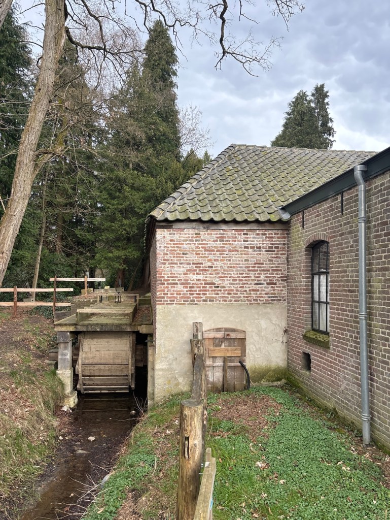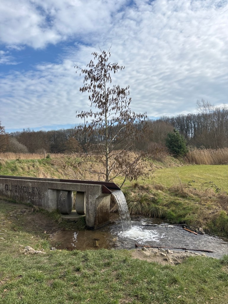 We naderen Oranje Nassau Oord, ooit een geschenk aan koningin Emma van haar liefhebbende echtgenoot koning Willem III (bijgenaamd Gorilla). Op een kruising van wegen met een groepje rokende mensen ontdekt Henk een bordje. Kun je daar koffie krijgen?, klinkt zijn noodkreet. Ik nader het bordje en ontdek dat aan de andere kant een brasserie is. We kunnen een gebouw in de vorm van een halve cirkel in en komen uit bij de brasserie. We ontmoeten bewoners en gasten en doen onze bestelling temidden van de gezellige drukte. Hier is de Zinzia Zorggroep aan het werk. Na een smakelijk verblijf gaan we via een andere weg op zoek naar de route. Dat zoeken lukt ons. We wandelen langs de Ommuurde Tuin, een agro-ecologisch biologisch tuinbouwbedrijf van één hectare. Een hele mond vol. Hier was in oude tijden de moestuin van koning Willem III. Of hij hier vaak getuinierd heeft weet ik niet. Vlak bij Harten raakt Henk aan de praat met een dame op een bankje en dat geeft mij de gelegenheid om een paar foto’s te maken. We zijn hier al aan de rand van het beroemde Renkums Beekdal. Gezamenlijk lopen we door langs het monument De Oliemolen. Ik dacht dat het om een papierfabriek ging, gezien de rollen die ik meende te zien. En wat blijkt? Het was eerst een papiermolen en later in 1810 een oliemolen, in 1882 werd het een korenmolen. De molenmakers zullen er druk mee zijn geweest. We gaan de Hartenseweg verlaten en volgen een smal pad langs de begraafplaats. Bij een ven steken wij de Oliemolenbeek over en stappen het Renkums Beekdal in, heel voorzichtig, want we gaan over een lang vlonderpad. Op meerdere plaatsen zien we stromend water onder het vlonderpad gaan. Dat er hier weer water stroomt is bijzonder. Aan het uiteinde van het vlonderpad gaan we naar het noorden en volgen het beekdal. We ontmoeten kabouters op ons pad en ook een kabouterpad. De zin hiervan ontgaat mij nog steeds. Is er toch buiten de kabouters genoeg te zien en te doen in een bos?! Bij Boscafé De Beken nemen we plaats op het terras. Het is net niet koud genoeg om naar binnen te gaan. Alhoewel het al later is gaat een twaalf-uurtje er goed in. Naast ons vindt een werkgesprek plaats van zes mensen. Vaak zijn de teksten woordelijk te verstaan. Na aangesterkt te zijn door eten en drinken gaan we verder.