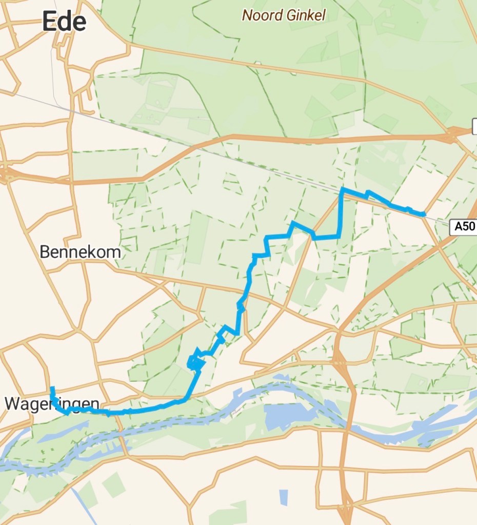 Een hele dag parkeren voor €8. Dat is te doen. Vooraf betalen. Geen verrassingen achteraf. De naam van het parkeerplein doet vermoeden dat de stad Wageningen in een ver verleden gastvrouw is geweest voor de Olympische Spelen. Het jaartal kan ik mij niet herinneren. We gaan een klein stukje route gelijk op met het einde van onze vorige etappe. De etalage van De Beschte, tweedehandsboeken, wordt bekeken en wij ontdekken meerdere boeken van de onlangs overleden Cees Nooteboom. Bij IMAGINE zeggen we: misschien aan het einde van de dag. Langs Hotel De Wereld, met bevrijdingsassociaties. Of was wat daar gebeurde niet meer dan een fotomoment? Langs het Torckpark. Even op de Grebbedijk met mooie vergezichten. Dan bestijgen we het Bergpad, een smal pad achter de zuidelijke huizenrij in dit deel van Wageningen. Het pad gaat omhoog en wij met het pad. We zijn niet de enigen op dit pad. We gaan achterlangs huizen en lopen in het groen. We hebben mooie uitzichten. Wij passeren Het Depot, een beeldengalerij, maar van onze kant kunnen wij er geen beeld bij krijgen. Dan langs het Schip van Blaauw, met de opvallende architectuur. Vroeger huisde in dit gebouw het Laboratorium voor Plantenfysiologie. De architect heette Blaauw. De hoogleraar die daar ging werken heette ook Blaauw. Beiden waren geen familie. We steken de Westbergweg over en gaan verder op het Bergpad, onderlangs het Belmonte Arboretum en een hotel. We kunnen door de bomen nog net iets zien van het oude stadion van de profclub FC Wageningen. In 1992 kwam er een einde aan de profclub en de bijbehorende ambities. En als laatste komen we vlak langs de Oranjelaan, waar nog steeds de 26 noodwoningen staan die na de Tweede Wereldoorlog hier werden gebouwd. Ondanks pogingen om de sloophamer hier te hanteren is het de bewoners gelukt om dit bijzondere plekje in stand te houden. We dalen van de Wagenings Berg af, ontmoeten de voorbereidingen van de paddentrek en steken de Ritzema Bosweg over.nood.