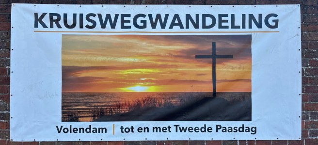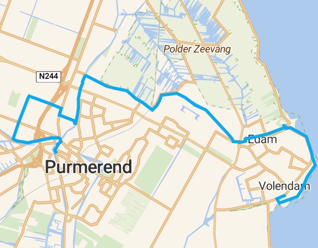 In Volendam stap ik uit bij Halte Volendam Centrum, dat is niet één bushalte te ver. Bij deze halte staat de Maria Sterre der Zee-kerk, met de aankondiging van de Kruiswegwandeling die zal plaatsvinden in het dorp. Ik loop terug naar de bushalte Volendam Marina en dan loop ik op de route van het Waterliniepad. Ik heb gekozen voor dit pad omdat ik van iemand dit routeboekje cadeau kreeg. Het zat bij zijn kerstpakket. Er zijn mensen die liever gaan fietsen dan wandelen. Niet gedraald door historische overpeizingen. Ik ga het Zuideinde op en ik constateer dat de bewoners hier dicht bij de straat wonen. Dan kom ik op de dijk bij de haven. Een enkel terras is al open, winkels met snuisterijen, shirts met de opdruk AMSTERDAM (niet Volendam). Een enkele toerist. Het is nog rustig op de dijk. Een grote groep oudere mannen zit in het Leugenbankhuisje. Ik passeer het beroemde hotel van Spaander. Winkels waar je jezelf in Volendams kostuum kunt hijsen en laten fotograferen. Aan het Noordeinde merk ik dat er gewerkt wordt aan versterking van de dijk. Althans, ik zie twee lassers aan het werk. Verder wordt de vrijdagsrust hier niet geschonden. Gelukkig kan ik een eindje over de Zeedijk lopen, op dit wandelpad waagt zich een enkele oudere fietser. Bij de Keetzijde steek ik de zeesluis over en arriveer in Edam. Als snel verlaat ik het Oorgat en de route om Fort bij Edam van dichtbij te bekijken. Dat dichtbij lukt maar ten dele, want vandaag is het Fort niet open en het hek voor de brug blijft gesloten. Op de hoek van Oorgaat en Klundert zie ik een kleine joodse begraafplaats. Vroeger lag deze begraafplaats net buiten de Oosterpoort. Aan de overkant van der straat is een monument ter herinnering aan al die joodse bewoners die zijn omgekomen tijdens de Holocaust. Dan kom ik op de Voorhaven. Het is een genot om hier te wandelen. Aan deze zijde van het water en aan gene zijde staan vele prachtige oude huizen. Zelfs is er nog een voormalig klooster langs de Voorhaven. Wanneer ik op de Lingerzijde loop zie ik plots een losgebroken buslading toeristen over de Kwakelbrug mijn richting uit komen. Ik sla gauw rechtsaf en vervolg mijn weg over de Lingerzijde. Wanneer ik onder de N247 ben ik gegaan heb ik het oude centrum van Edam achter mij gelaten. Edam en Volendam verhouden zich tot elkaar als Kunst & Kitsch.